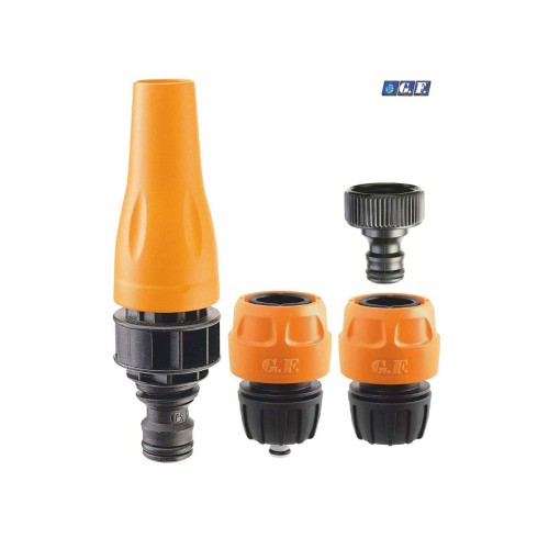 Kit completo formado por una lanza de riego y tres racores de conexión rápida para mangueras de 1/2” y 3/4”.