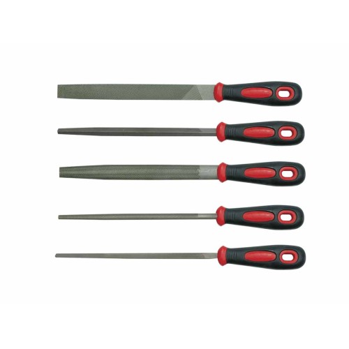 Incluye 5 limas de 200 mm con formas variadas: media caña, redonda, plana, triangular y cuadrada.