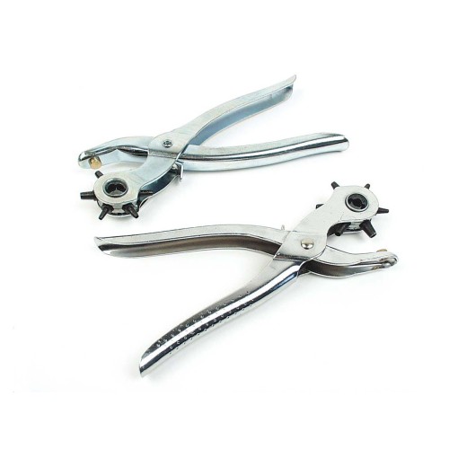 Alicate sacabocados de tipo revólver con una longitud total de 220 mm, ideal para realizar perforaciones limpias y precisas en materiales como cuero, goma, cartón o plástico.
