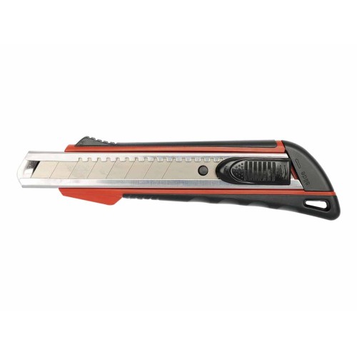 Ancho (en mm): 18 Forma ergonómica: Si Tipo de hoja: Fraccionable Empuñadura: Bimateria Seguridad: Bloqueo automático Grosor de la hoja (en mm): 0,5 Colgable: Mediante cordel del orificio inferior trasero