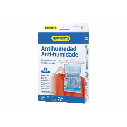 El deshumidificador HUMYDRY Bolsa Colgante 450g está diseñado para eliminar el exceso de humedad en espacios cerrados de hasta 15 m².