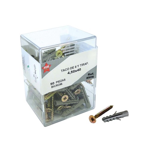 Caja profesional compuesta por tacos de polipropileno de alta calidad y tirafondos de acero con acabado bicromatado, diseñada para ofrecer una fijación fiable en trabajos profesionales.