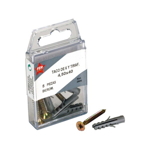 Estuche compuesto por tacos de polietileno de alta calidad junto con tirafondos de acero con acabado bicromatado, diseñado para ofrecer una fijación fiable y versátil en múltiples aplicaciones.