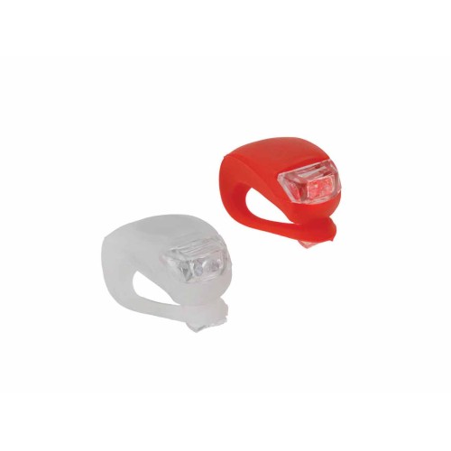 Pack de señalizadores LED para bicicleta compuesto por dos unidades: uno frontal de luz blanca y otro trasero de luz roja.