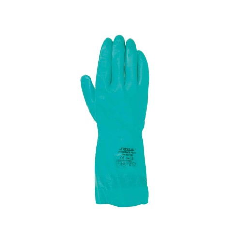 Guante de nitrilo flocado verde diseñado para ofrecer alta protección en entornos secos, húmedos y aceitosos.