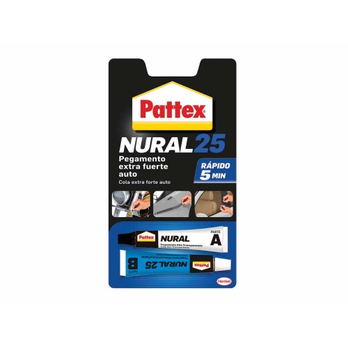 El adhesivo extra fuerte Pattex Nural 25 Auto es un adhesivo bicomponente transparente diseñado específicamente para reparaciones exigentes en el ámbito del automóvil.