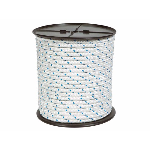 Diámetro (mm): 8 Largo (en m): 100 Peso 100m (en kg): 5 Rotura (en kg): 1000 Trenzado: Interior trenzado y exterior de poliamida blanco brillante Trenzado: El cordón bicolor lleva un 25% de color en su exterior Resistencia: Muy buena resistencia al roce Propiedades: Flexible y muy suave al tacto Propiedades: Larga duración a la intemperie