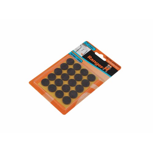 Diámetro (en mm): 17 Forma: Redondo Cantidad (en uds): 20 Fijación: Autoadhesivo Protección: Fieltros que cubren los extremos en contacto con el suelo de patas de sillas, mesas y otro mobiliario.